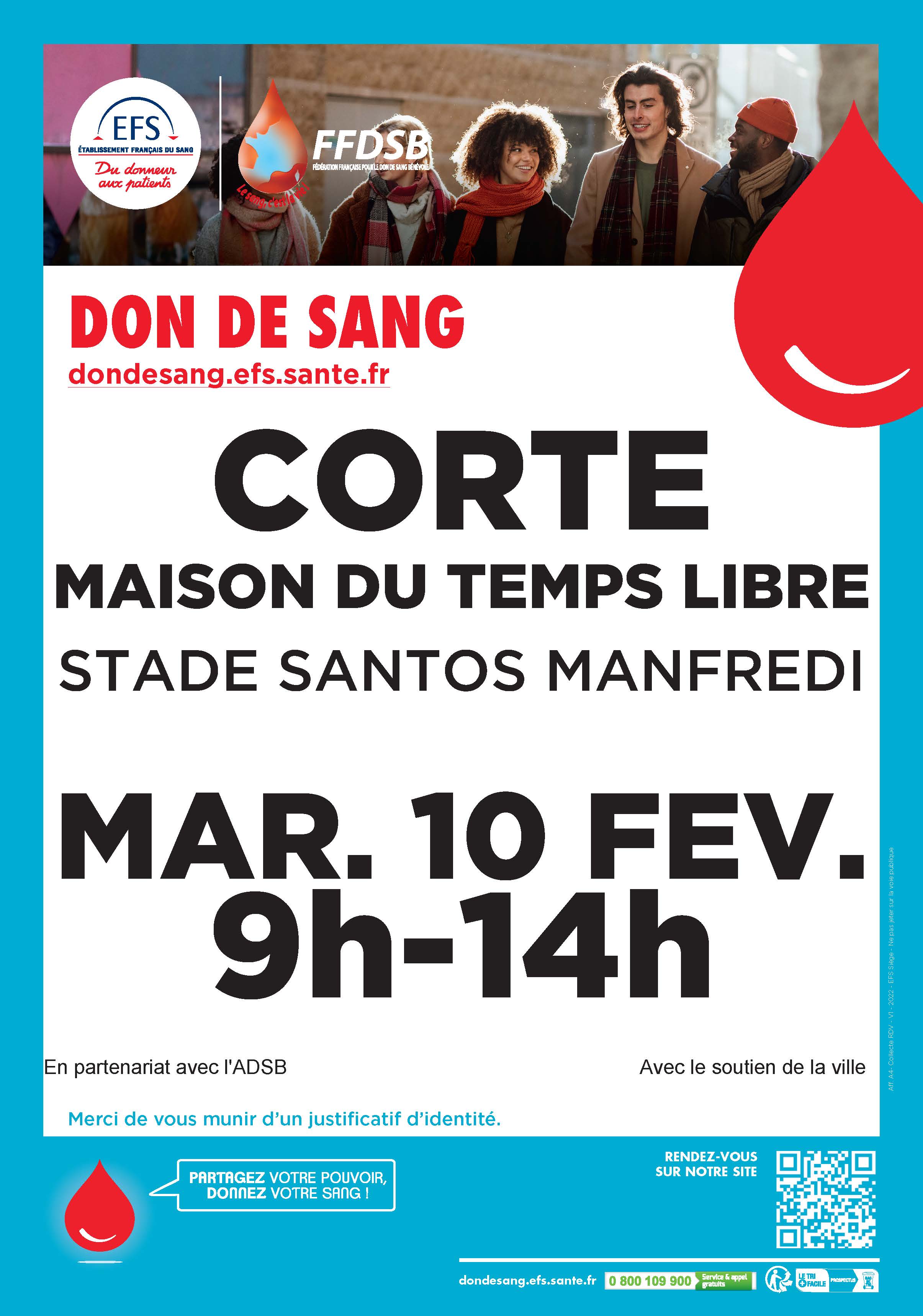 Don de sang à Corte : Mardi 10 février 2026 de 9h00 à 14h00 à la Maison du Temps Libre