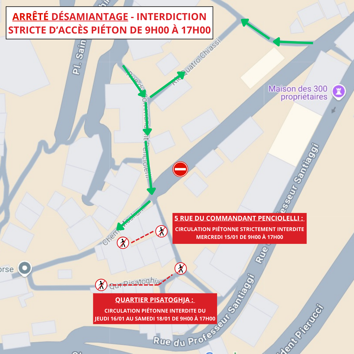 En raison de travaux de désamiantage et pour des raisons de sécurité, la circulation piétonne sera strictement interdite : - le Mercredi 15 janvier 2025 de 9h00 à 17h00 au 5 rue Commandant Penciolelli - du Jeudi 16 au Samedi 18 janvier de 9h00 à 17h00 Quartier Pisatoghja.