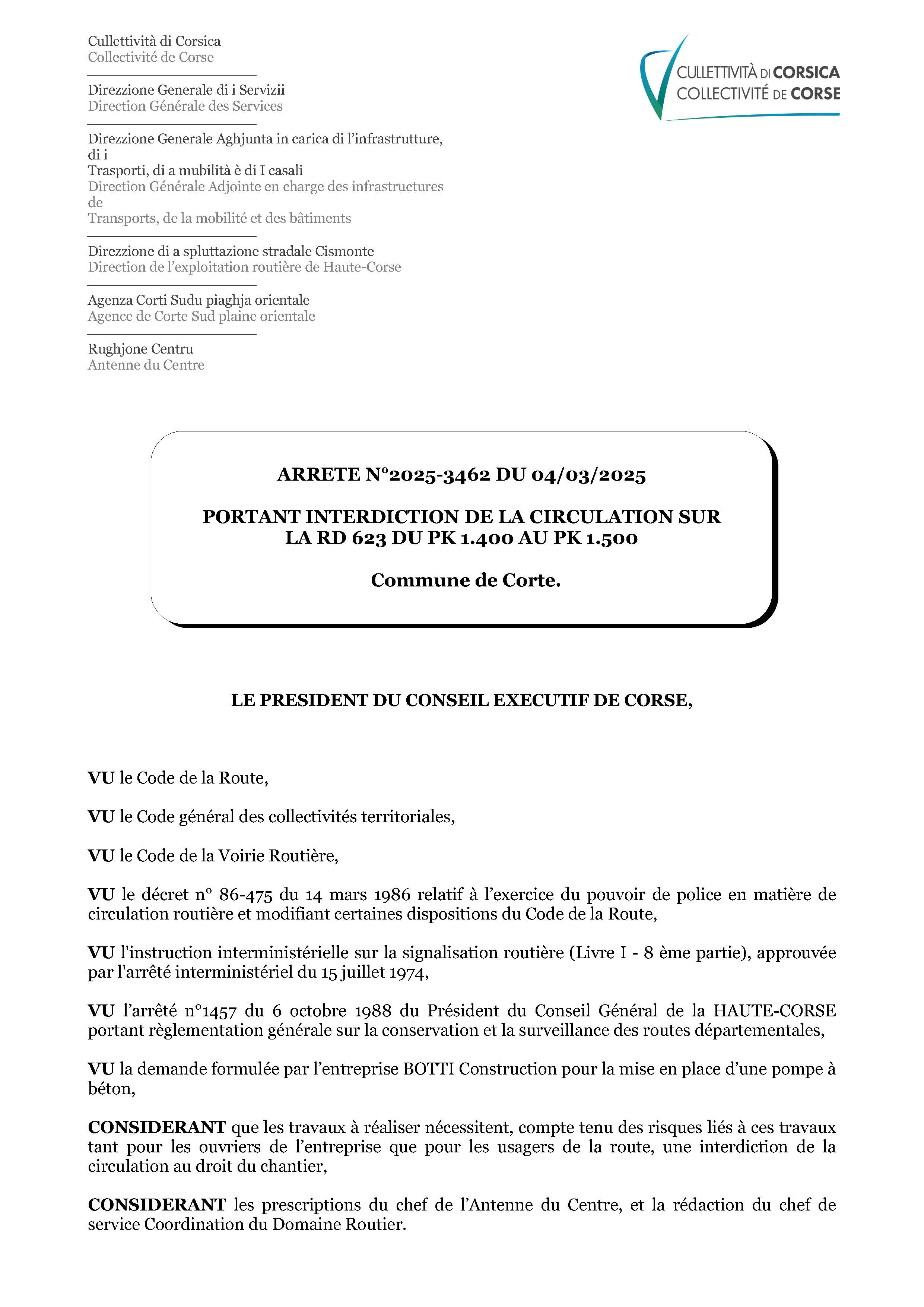 Actualités10 mars 2025 Arrêté d'interdiction de circulation - Vallée de la Restonica - Lundi 10 mars 2025