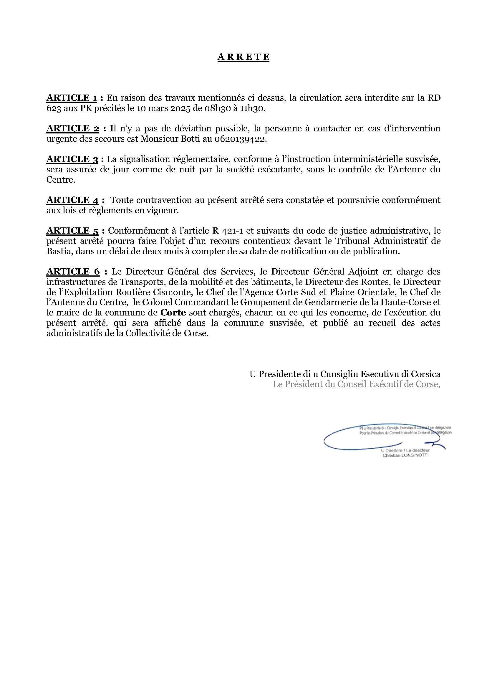 Suite à la publication d'un arrêté de circulation pour travaux sur la RD623 par la Collectivité de Corse, la route de la Vallée de la Restonica sera fermée à la circulation à partir de l'Hôtel Colonna ce lundi 10 mars de 8h30 à 11h30.