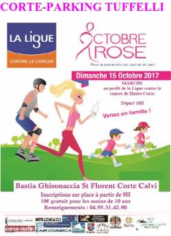 Actualités09 octobre 2017 Octobre Rose - Marche pour la Ligue contre le cancerMarche pour pour la Ligue Contre le cancer de haute-Corse Dimanche 15 Octobre 2017 La Ligue contre le Cancer organise une Marche contre le cancer , le dimanche 15 Octobre à partir de 10h. Le départ se fera du Parking Tuffelli et la marche aura lieu dans toute la Ville. Inscriptions sur place à partir de 09h : 10€, gratuit pour les moins de 10 ans Renseignements : 04.95.31.42.90