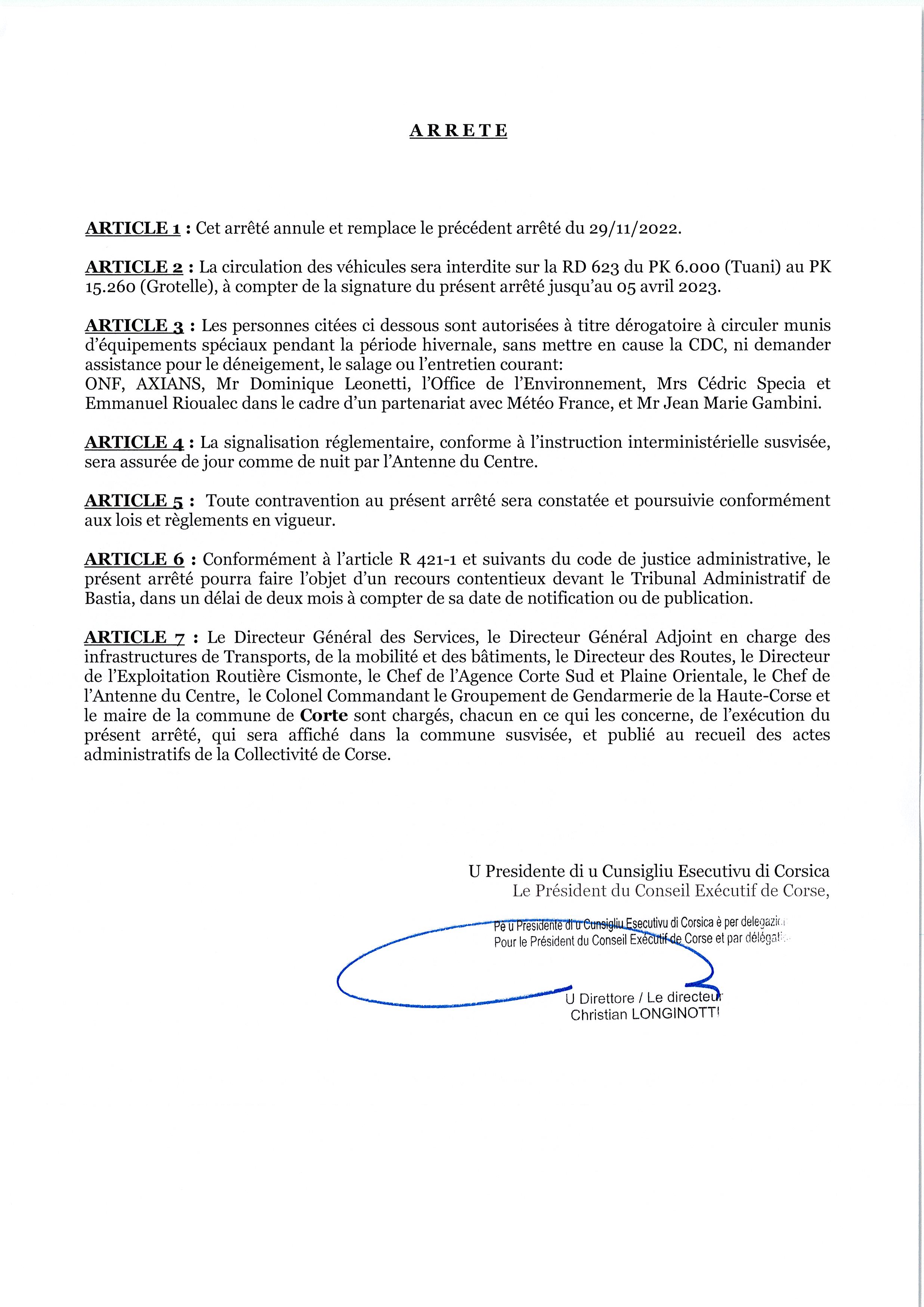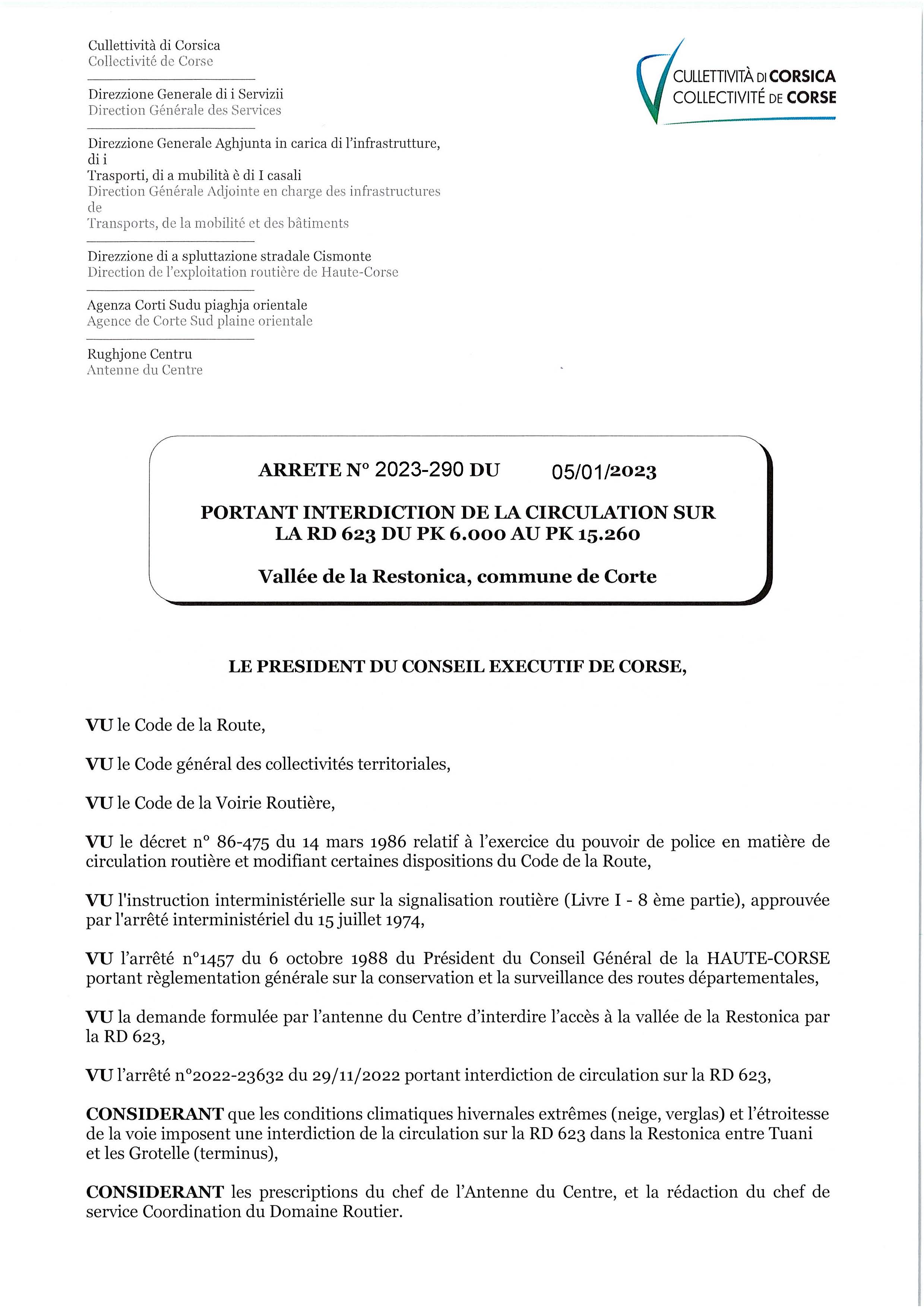 PDF : Arrêté d'interdiction de la circulation - Vallée de la Restonica