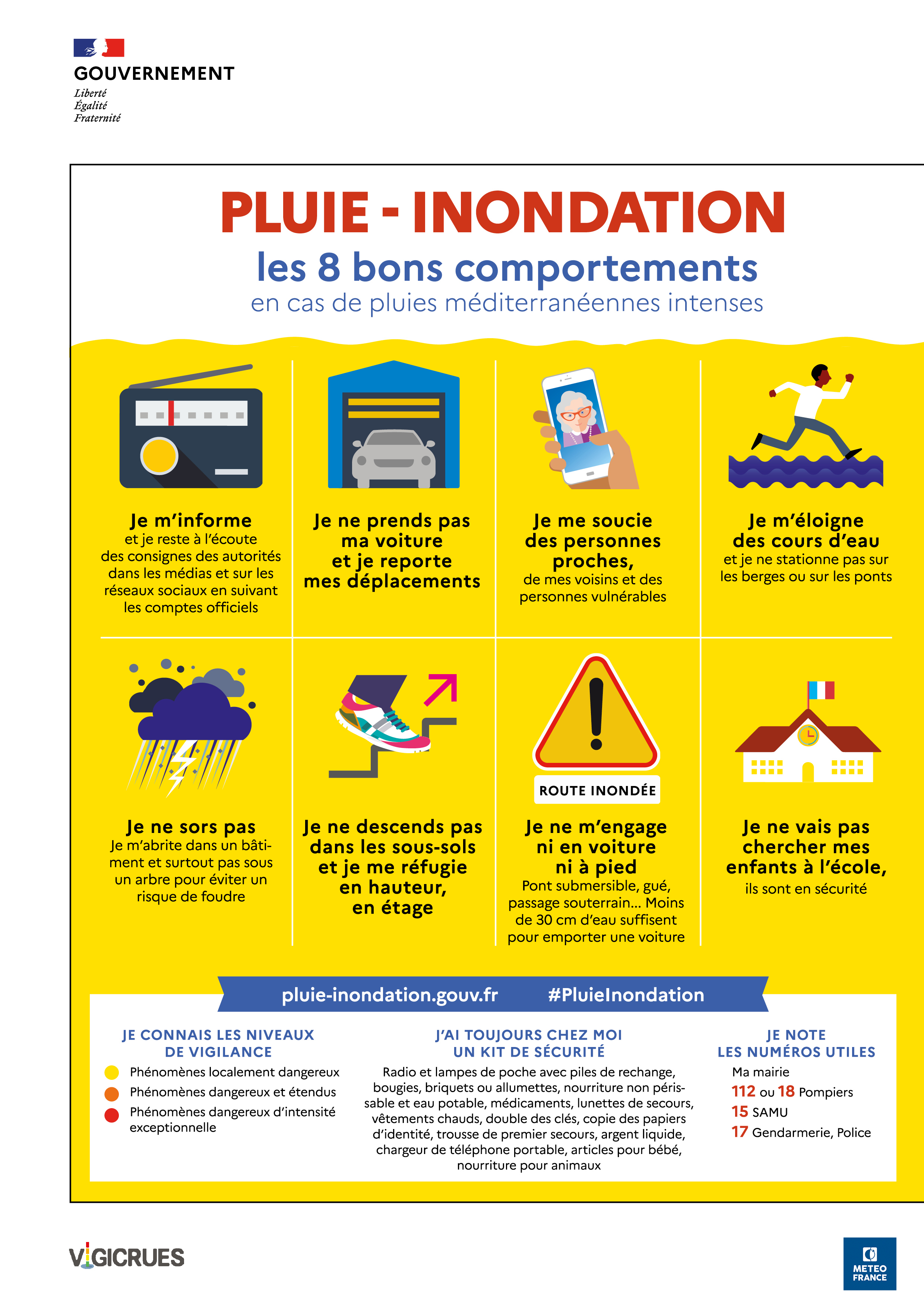 Des averses et des orages provenant de la Méditerranée remontent sur l’est de la Corse en cours de journée de vendredi. En première partie de nuit, l’activité se renforce nettement. Les intensités pluvieuses sont proches de 30 à 50 mm en peu de temps. Ces averses et orages se produisent principalement sur l’est et le sud de l’île. Ils perdurent toute la journée de samedi. Les cumuls attendus sur l’épisode sont de l’ordre de 50 à 80 mm sur le littoral oriental et en plaine, 100 à 150 mm sur le relief et les contreforts est de l’île, localement 200 à 250 mm voire plus. La limite pluie-neige se situe vers 2000m. L’activité devrait faiblir en seconde partie de nuit de samedi à dimanche. La Préfecture appelle chacun à la plus grande prudence face à de tels phénomènes qui peuvent être dangereux. La population est invitée à respecter les consignes de sécurité pour éviter toute situation dangereuse :