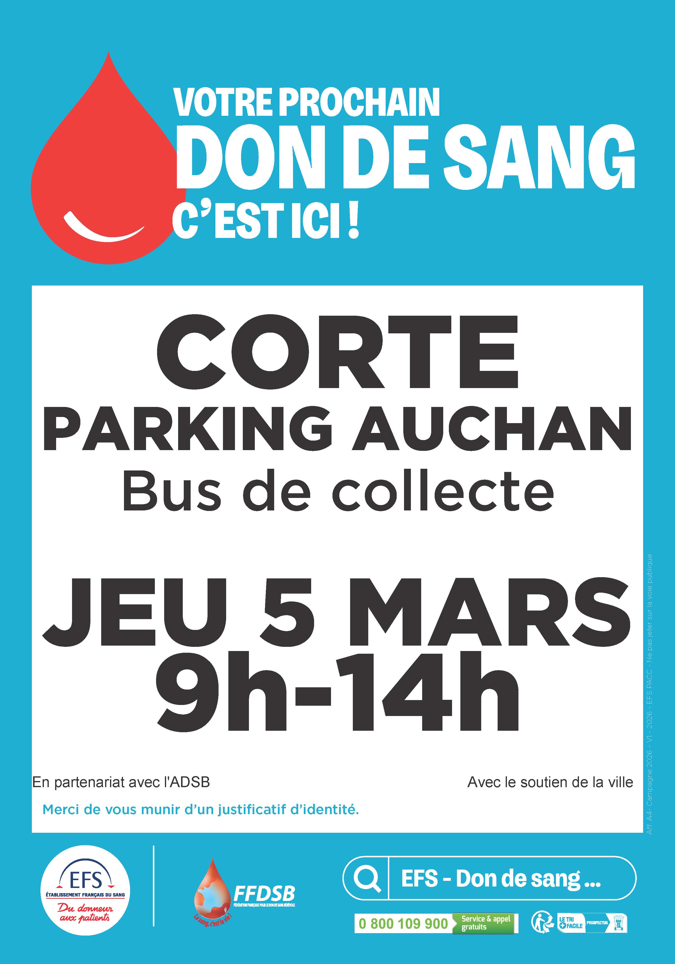 Don du sang : le jeudi 5 mars de 9h00 à 14h00 - Parking Auchan