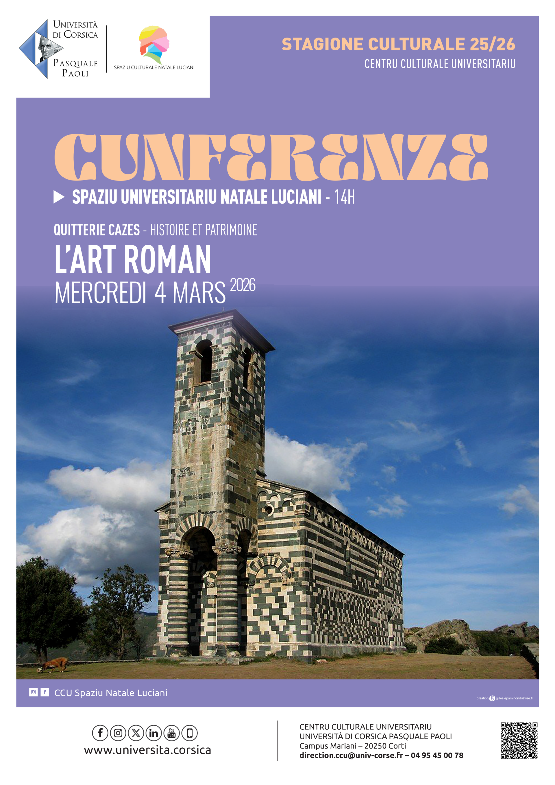 Mercredi 04 mars 2026 à 14h00 Le patrimoine de la Corse possède de nombreuses églises qualifiées de romano-pisanes. La nature même de la présence pisane est aujourd’hui l’objet de débats au sein des historiens médiévistes qui s’accordent sur le fait que ces églises ont été édifiées dans leur très grande majorité par des Corses. Quant à la définition même de l’art roman, elle soulève de nombreuses questions puisque cette terminologie n’a été inventée qu’en 1818. L’image que l’on se fait en général de l’église romane est confuse car austère, sans lumière et non décorée alors que la plupart sont peintes (Saint Savin sur Gartempe), lumineuses et peuvent être de grandes dimensions (Saint Sernin à Toulouse, Duomo de Pise, Cathédrale de Spire). Quitterie Cazes, professeure d’histoire de l’art médiéval à l’université de Toulouse, apporte une vision renouvelée de cet art du XIe et XIIe siècles qui doit être compris en fonction d’une spiritualité particulière liée au contexte religieux mais aussi politique et économique d’une époque encore largement inscrite dans l’héritage des techniques de construction de la civilisation romaine.