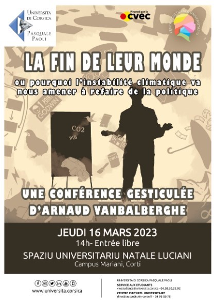 Centre Culturel Universitaire : Conférence gesticulée "La Fin de leur Monde"Date : Jeudi 16 mars 2023 à 14h00 Lieu : Spaziu Universitariu Natale Luciani Conférencier : Arnaud VANBALBERGHE